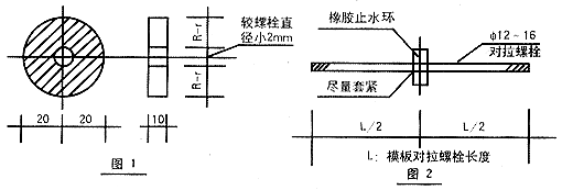 在傳統(tǒng)的混凝土墻體模板支設中,對拉螺栓板條式拉桿是連接內外兩組豎向模板的主要連接件,由于固定鋼模板所采用的成千上萬個對拉螺栓因其通長穿透墻壁,從而喪失了防水混凝土自身具備的防水功能。為了解決這個問題,目前施工中采用的是對拉螺栓中部焊一塊2-3mm厚,80mm×80mm鋼止水板。這種方法缺陷是:對焊縫的質量難以檢查和保證,而且是被動防水,一旦有焊縫發(fā)生裂紋、夾渣、燒穿、針狀氣孔等缺隱,便產生今后的滲水通路且難以治愈。